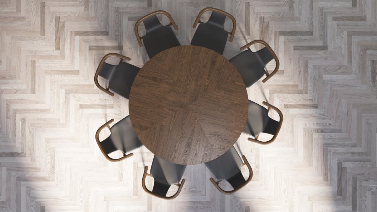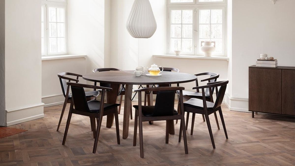 The #128 dining table is our largest fixed-top table with a diameter of 150 cm and can seat up to 9 people. The grain of veneer on the four parts of the tabletop points towards the centre of the table, which gives the tabletop an exciting expression. The four strong legs are fitted with black steel braces to stabilize and to create a both distinctive and resilient look.